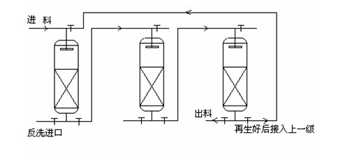 應(yīng)用方案為:首先從pH值來看,pH值:3~9,說明該鎢酸鈉溶液已經(jīng)經(jīng)過Na2S并調(diào)pH沉鉬MOS3,加入90~95%左右鉬硫代化反應(yīng)MO42-﹢4S2-﹢4H2O=MS42-﹢8OH- 所需理論量的硫化鈉,再將溶液的pH值調(diào)至8.0左右進(jìn)行硫代化2小時,然后將溶液的PH值調(diào)至2.0~3.0左右,煮沸后,將溶液稀釋一倍,冷卻后過濾的結(jié)果;· 從鎢酸鈉含量:30~60g/l;鉬酸鈉含量:0~2g/l;釩酸鈉含量:0.5~0.7g/l,以及后面鈉離子和相關(guān)陰離子等都表明溶液也已沉鉬;· 針對客戶要求:提取釩、同時提取鎢與鉬、或鎢與鉬分離。二、鎢鉬分離原理及分離方法1、基本原理 鎢和鉬對硫的親合力存在一定差異,在一定條件下可使鉬酸根離子優(yōu)先較完全硫代化成為硫代鉬酸根離子,反應(yīng)如下(M代表W和MO): MO42-﹢S2-﹢H2O=MO3S2-﹢2OH- (1)MO42-﹢2S2-﹢2H2O=MO2S22-﹢4OH- (2)MO42-﹢3S2-﹢3H2O=MOS32-﹢6OH- (3)MO42-﹢4S2-﹢4H2O=MS42-﹢8OH- (4) 中南大學(xué)盧江波等[4]對鎢鉬的硫代化反應(yīng)的熱力學(xué)機(jī)理進(jìn)行了研究,推算出了在25℃時,反應(yīng)(1)至(4)的平衡常數(shù),從鎢、鉬的硫代化反應(yīng)平衡常數(shù)可以看出,鉬的各級硫代化反應(yīng)的平衡常數(shù)比鎢同級硫代化反應(yīng)的平衡常數(shù)高出兩個數(shù)量級左右,故鉬能夠優(yōu)先硫代化。在隨后的調(diào)酸過程中硫代鉬酸鹽轉(zhuǎn)變成MoS3沉淀,而大部分的鎢則保留在溶液中,從而實(shí)現(xiàn)兩者分離。 2、鎢、鉬、釩的性質(zhì)與分離方法鎢鉬分離是鎢鉬提取冶金中一道重要的工序,目前工業(yè)上應(yīng)用的方法主要有:三硫化鉬沉淀法、選擇性沉淀法、離子交換法、萃取法等。這幾種方法多用于從鎢酸鹽溶液中除去少量的鉬(MO<1g/l, WO3/ MO>100)。而在鎢(鉬)廢料回收處理中經(jīng)常會碰到WO3/MO比較接近的原料需進(jìn)行鎢鉬分離,如廢催化劑、各種鎢鉬廢渣等。因此,從高鉬鎢溶液中(或高鎢鉬溶液)實(shí)現(xiàn)鎢鉬分離方法為加入90~95%左右鉬硫代化反應(yīng)MO42-﹢4S2-﹢4H2O=MS42-﹢8OH- 所需理論量的硫化鈉,再將溶液的pH值調(diào)至8.0左右進(jìn)行硫代化2小時,然后將溶液的PH值調(diào)至2.0~3.0左右,煮沸后,將溶液稀釋一倍,冷卻后過濾,由于鉬的硫代反應(yīng)比鎢的硫代反應(yīng)優(yōu)先,大部分的鎢則保留在溶液中,從而實(shí)現(xiàn)兩者的分離,實(shí)現(xiàn)鉬鎢分離后得到的調(diào)酸液Mo/WO3降至0.03左右;得到的硫化鉬渣WO3/Mo降至0.04左右。鎢在水溶液中的化學(xué)性質(zhì)較復(fù)雜,除生成正鎢酸根離子之外,還生成穩(wěn)定的同多鹽和雜多酸鹽。關(guān)于正鎢酸根離子形成 仲鎢酸根陰離子或偏仲酸根陰離子的聚合形式,不同的研究者提出了不同的表達(dá)式,主要有以下幾種:1)、凱泊特等提出的表達(dá)式為: 2)、戈登等提出的表達(dá)式為: 鉬在水溶液中的化學(xué)狀態(tài)可由下式表示: 在較高酸度(pH<2.0)條件下,鉬呈陽離子形式存在,而鎢主要以陰離子形式存在,而且容易生成鎢酸沉淀,在酸度較低時,又容易生成鎢、鉬雜多酸,從而使二者的分離變得困難。鉬和釩的性質(zhì)較為相似,因此在溶液中它們的存在形態(tài)及行為也比較相似,在pH值大于或等于6.5時,鉬在溶液中只以鉬酸根陰離子存在;在pH值為6.5~2.5的區(qū)間內(nèi),發(fā)生聚合反應(yīng),生成各種多鉬酸根陰離子;在溶液的pH值小于2.5時,生成MoO2+2或更為復(fù)雜的陽離子;在pH 值低于1時,陽離子是主要的存在形式。釩在溶液中的聚合狀態(tài)不僅與溶液的酸度有關(guān),而且也與其濃度關(guān)系密切。當(dāng)釩濃度很低時,在所有的pH值下釩均以單核形式存在。當(dāng)釩濃度高時,產(chǎn)生聚合反應(yīng),生成高聚合度的同多酸離子,其聚合狀態(tài)與溶液的pH值相關(guān)。當(dāng)釩濃度一定時,在pH 值大于1O時,釩主要以VO43-一形存在;在pH值為9.6~10.0之間時,釩主要以V2O74-一形態(tài)存在;在pH值為7.0~7.5之間時,釩主要以VO3-形態(tài)或者偏釩酸銨分子形態(tài)存在,尤其是當(dāng)溶液中有銨鹽存在時,因共同離子效應(yīng),偏釩酸銨分子是主要的存在形態(tài)。當(dāng)pH 值小于4時,在一定條件下,釩可以依次形成各種陽離子:VO2+、V3+、V(OH)2+和V2+,當(dāng)含釩溶液的pH值小于1時,釩主要以VO2+形態(tài)存在。從上述可知,在一定pH值條件下,利用螯合樹脂吸附偏釩酸銨分子和釩氧陽離子而不吸附鉬酸根陰離子的特性可以實(shí)現(xiàn)鉬釩分離。三、樹脂選擇目前爭光開發(fā)此類樹脂情況如下:將溶液pH調(diào)到2~3: 1、先采用爭光1#樹脂,該種樹脂對釩的吸附是分子吸附或陽離子吸附。而鎢、鉬都是以雜多酸的陰離子形式存在,不會被該樹脂吸附;采用2BV2mol/L的NaOH作解析劑對負(fù)載釩的樹脂進(jìn)行解析。2、再采用爭光2#樹脂來吸附,這時可以將鎢、鉬同時吸附到樹脂上。在pH=2.5~4時,鎢鉬形成聚鎢酸根離子和聚鉬酸根離子,用轉(zhuǎn)成硫酸根或氯根型態(tài)的2#樹脂能吸附97%以上的鎢鉬,用10%氨水作解吸劑,解吸效果很好。清洗好后可進(jìn)行下次吸附,重復(fù)使用性能穩(wěn)定。吸附容量為130~150g/L-R。3、經(jīng)過2#吸附并洗脫得到的鎢酸銨和鉬酸銨溶液,這時,可以采用爭光3#樹脂在堿性條件下選擇性吸附鎢酸銨溶液中微量的鉬酸根,飽和后采用10%氫氧化鈉作解吸劑,解吸效果很好。清洗好后可進(jìn)行下次吸附,重復(fù)使用性能穩(wě